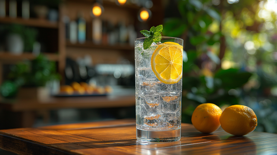 炭酸水を静かに注ぐことで、レモンの香りがふわっと立ち上がります。