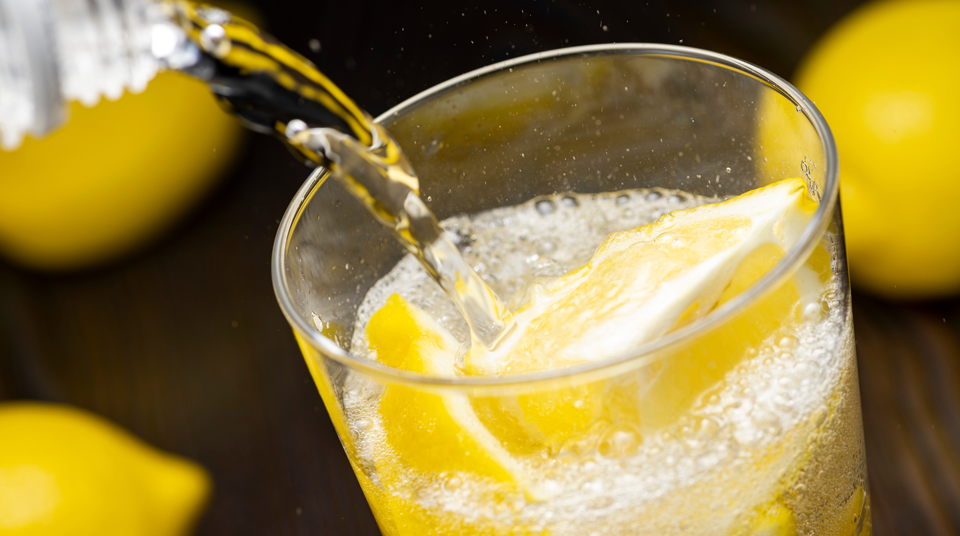 炭酸水を静かに注ぐことで、レモンの香りがふわっと立ち上がります。